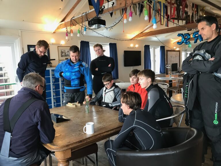 A shore session with Graham for a keen group last Saturday, too little wind to sail. Rule 42! Photo: Sally